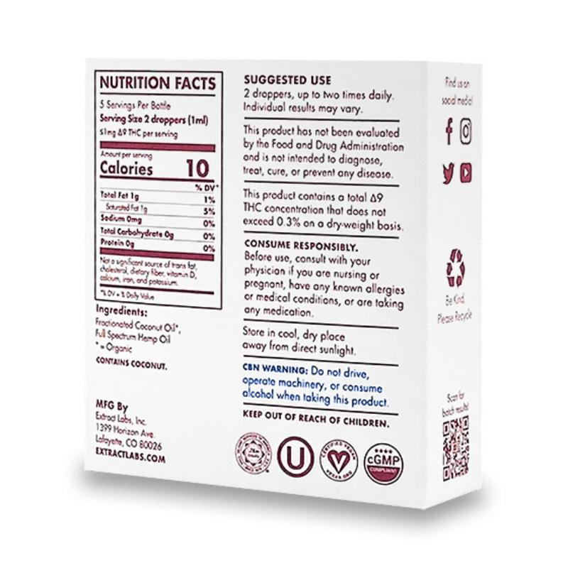 Extract Labs CBD Tincture does not contain any artificial colors, preservatives, or fillers. We deliver a tincture that is as close to nature as it can be. The only ingredients in our bottles are Coconut oil and non-GMO hemp grown with organic standards in the Colorado sun, extracted with carbon dioxide.