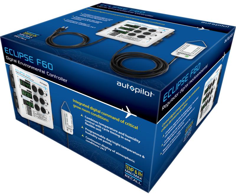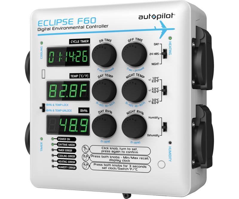 The Autopilot ECLIPSE F60 Digital Environmental Controller combines precise temperature and humidity control along with cycle timing to create an intelligent yet easy-to-use unit. Three digital screens continuously display current temperature, relative humidity, and a cycle timing countdown clock. LED lights indicate active modes and inform the user of any errors.