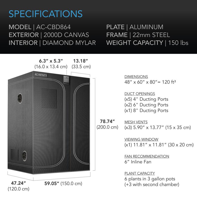 Introducing the AC Infinity 5x4 2-in-1 Advanced Grow Tent - the ultimate solution for year-round plant cultivation indoors. Whether you're a seasoned gardener or a beginner, this cutting-edge grow tent is designed to elevate your indoor gardening experience to new heights. Crafted with precision, this grow tent features a 50% thicker steel frame which ensures maximum stability and durability. Reinforced with a denser 2000D canvas, this tent is built to withstand the test of time. Say goodbye to pesky light leaks, as AC Infinity's innovative protective zipper flap guarantees total darkness and an optimal growing environment for your plants.