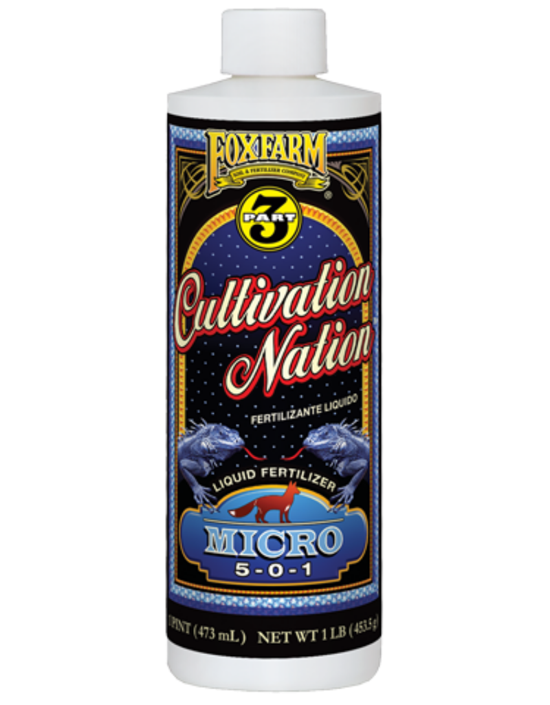 Liquid Fertilizer 5 - 0 - 1 Cultivation Nation Micro Fertilizer is part two in our 3-part liquid feeding program. Begin by introducing Cultivation Nation Grow Fertilizer, then supplement with Cultivation Nation Micro to supply your plants with important micronutrients, and finish strong with Cultivation Nation Bloom Liquid Fertilizer.